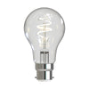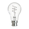 The bulb features a bayonet (B22) cap and a clear glass envelope. When switched off, it exhibits a white, twisted LED filament, embracing the look of traditional bulbs and without the distracting glare of the more common yellow toned LED filaments. It reaches full brightness in under 0.5 seconds, providing instant illumination—unlike older fluorescent energy-saving lamps that often flickered upon activation.