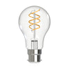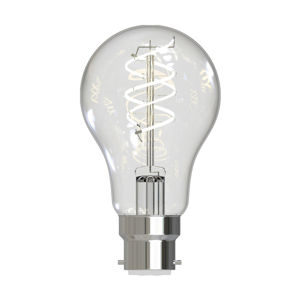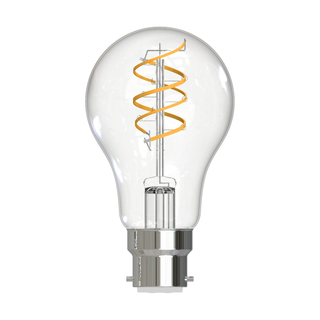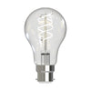 The bulb features a bayonet (B22) cap and a clear glass envelope. When switched off, the LED filaments exhibit a yellow-orange hue, typical of most LED bulbs. However, once illuminated, the filaments are not visible, and the bulb emits a consistent light. It reaches full brightness in under 0.5 seconds, providing instant illumination—unlike older fluorescent energy-saving lamps that often flickered upon activation.