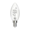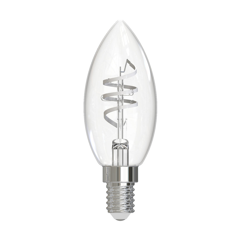 The bulb features an SES (E14) cap and a clear glass envelope. When switched off, it exhibits a white, twisted LED filament, embracing the look of traditional bulbs and without the distracting glare of the more common yellow toned LED filaments. It reaches full brightness in under 0.5 seconds, providing instant illumination—unlike older fluorescent energy-saving lamps that often flickered upon activation.