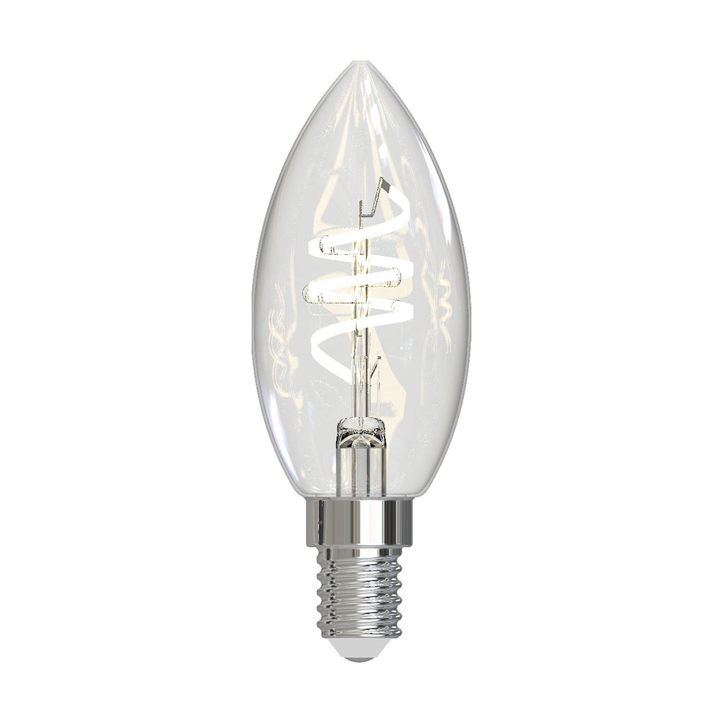 The bulb features an SES (E14) cap and a clear glass envelope. When switched off, it exhibits a white, twisted LED filament, embracing the look of traditional bulbs and without the distracting glare of the more common yellow toned LED filaments. It reaches full brightness in under 0.5 seconds, providing instant illumination unlike older fluorescent energy-saving lamps that often flickered upon activation.