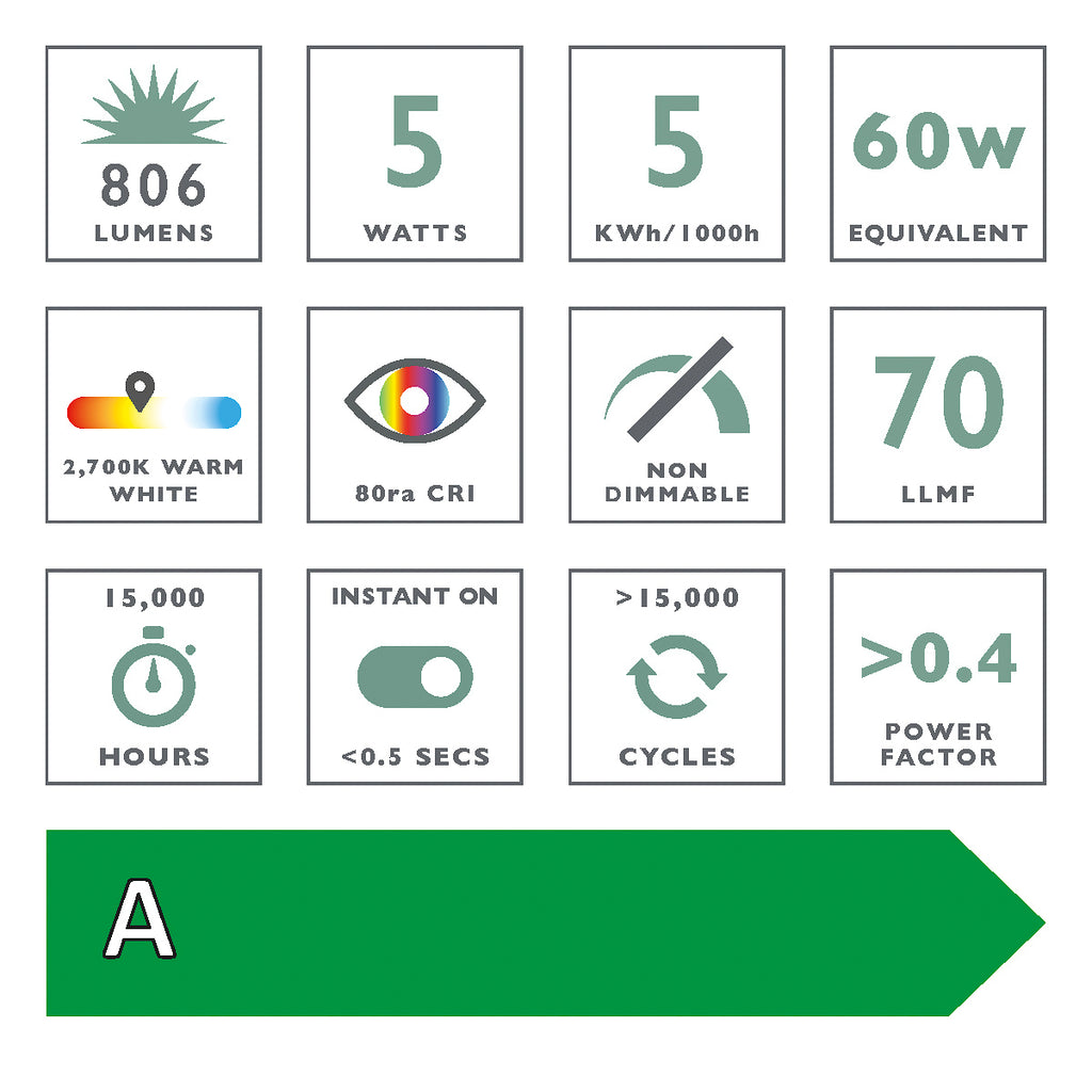 6PK E27 A60 LED GLS LAMP 3.8W 806LM 2700K - Sold in Pack of 6 - This LED GLS bulb by Dar Lighting consumes just 5W of electricity, making it a highly energy-efficient alternative to a traditional incandescent bulb. The bulb is non-dimmable, so incompatible with dimmer switches and touch lamps.