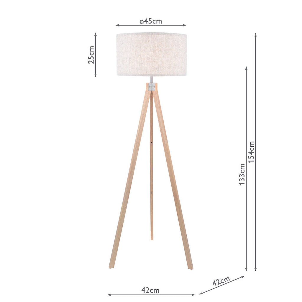 Armitage Tripod Floor Lamp Light Wood With Shade - Made of solid wood with a natural finish, the Armitage Tripod Floor Lamp has an air of rustic refinement. Its linen shade diffuses light for an ambient glow, whilst the wooden base gives it a stylish yet sturdy stance. Operated by a convenient foot switch on a white braided cable. Whether illuminating a reading nook or adding ambience to an entryway, this lamp cuts a dashing figure with its combination of contemporary white shade and wood in a natural finish. For setting the perfect scene, you’ll find this tripod floor lamp an absolute must. Once night falls, its warm and welcoming light is sure to become the focal point of your space. Please note; the shade is supplied in 3 sections and some light assembly is required. The Armitage Tripod Floor Lamp takes a single ES (E27) GLS bulb, which is not supplied. We recommend using LED filament lamps from our range of LED bulbs. SPECIFICATIONS: H:1540MM W/DIA: 450MM BASE MEASUREMENTS: H: 1340MM DIA: 420MM SHADE MEASUREMENTS: H:250MM DIA: 450MM MAX WATT:1 X 12W E27 (ES) GLS (BULB NOT INC.) CLASS: 2 - Double Insulated SWITCH: Foot Switch