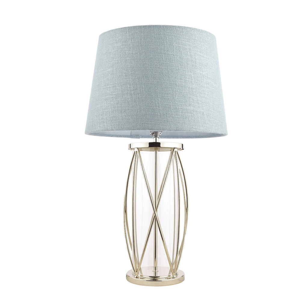 Laura Ashley Beckworth large table lamp - has a stylish lattice lantern base in a vintage polished nickel which encases a clear glass cylinder with a discreet clear cable and push bar switch. This table lamp base can also come complete with the Laura Ashley Bacall 40cm empire linen shade in Duck Egg Blue as shown or Silver. This table lamp is also available in a smaller version. SPECIFICATIONS: BASE H: 430MM DIA/W: 150MM MAX WATT: 1 X 60W BC (B22) Chrome GLS (BULB NOT INC.) CLASS: 1 - Earthed IP RATING: IP20 FINISH: POLISHED NICKEL,GLASS SWITCH TYPE: Push Bar