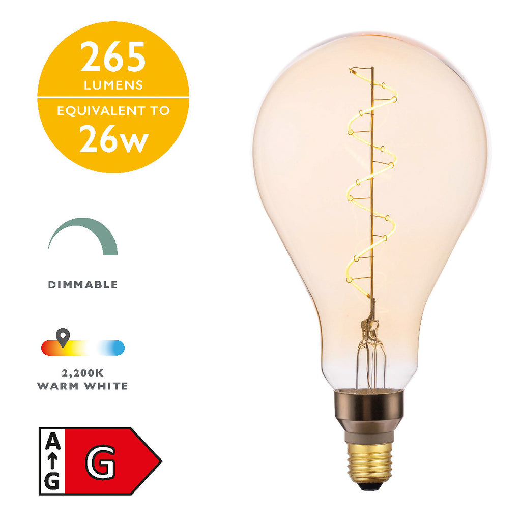 E27 LED DIMMABLE VINTAGE FLEX FILAMENT 4W 265 LUMEN GOLD - Single Oversized Decorative Dimmable LED Vintage GLS Light Bulb (Lamp) ES/E27; 4W; 265LM; 2200K Very Warm White; Amber Glass