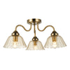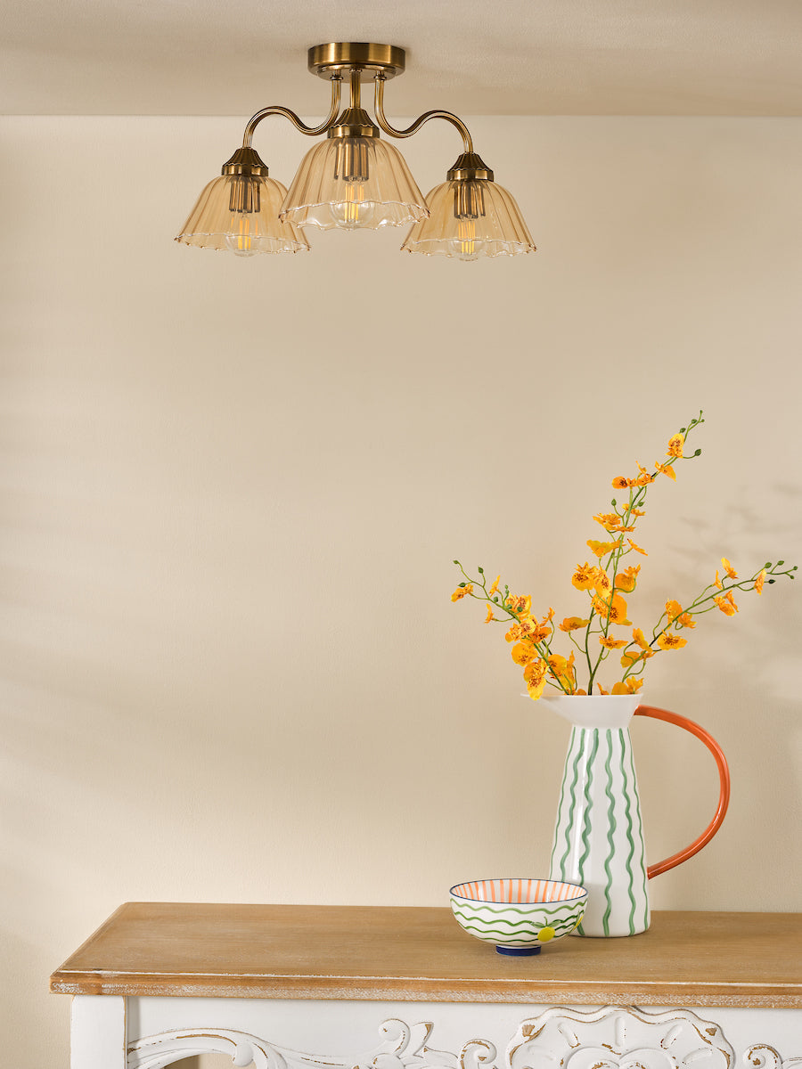 Erika 3 Light Semi-Flush Antique Bronze and Amber Glass - Add timeless elegance to your living space with the Erika 3 light semi flush ceiling light, designed for smaller rooms where style and function meet. Finished in warm bronze, its ribbed arms hold three delicate amber glass shades that cast a gentle, ambient glow. The semi flush profile makes it especially suited to spaces with lower ceilings, offering a neat silhouette without sacrificing decorative impact.