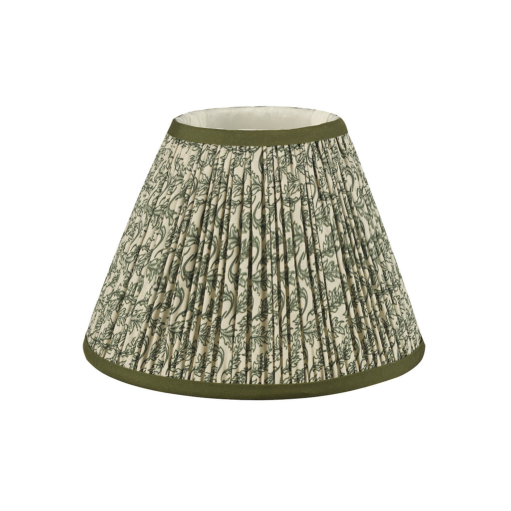 Esther Green Cotton Empire Shade 25cm - The Esther shade adds a touch of heritage charm to any interior, blending subtle pattern with timeless appeal. Made from a cotton-rich fabric and finished with a neat taped edge, it features a soft neutral background with a delicate leaf motif that suits both traditional and modern country schemes.