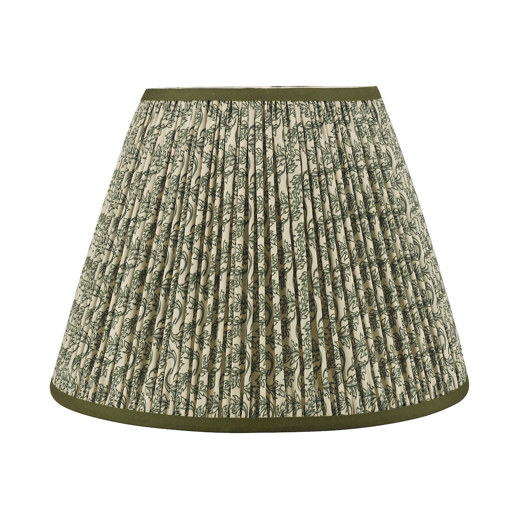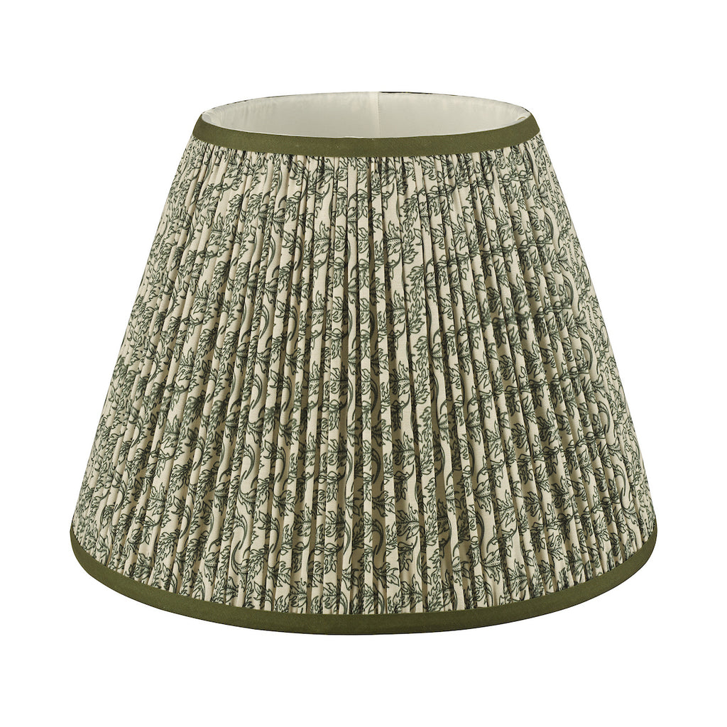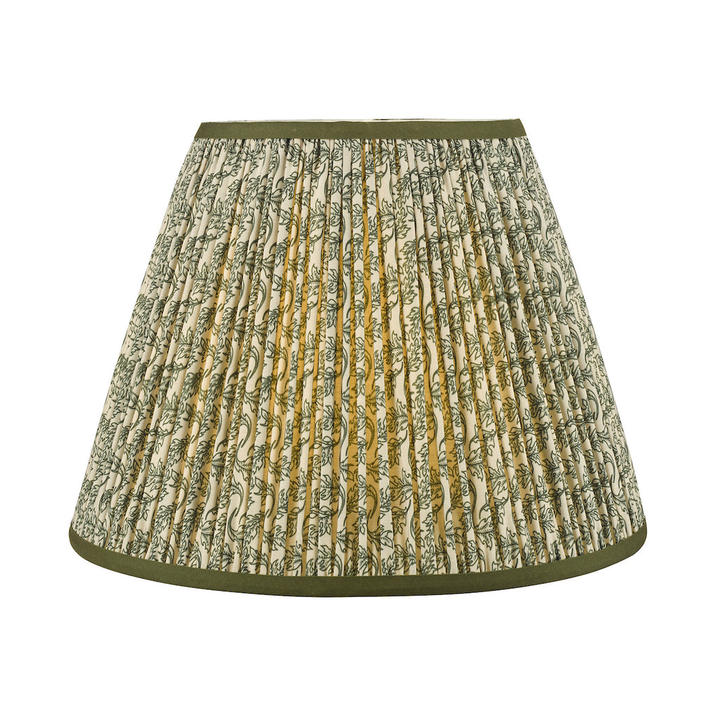 Esther Green Cotton Empire Shade 35cm - The Esther shade adds a touch of heritage charm to any interior, blending subtle pattern with timeless appeal. Made from a cotton-rich fabric and finished with a neat taped edge, it features a soft neutral background with a delicate leaf motif that suits both traditional and modern country schemes.