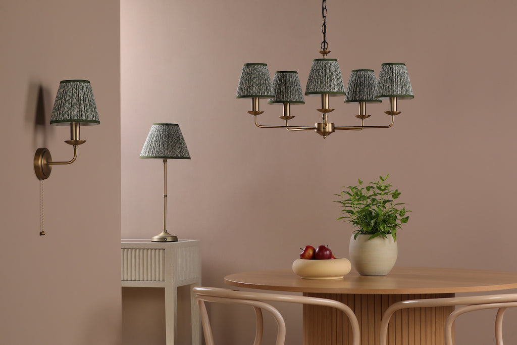 Compact yet elegant, it’s perfect for hallways, bedrooms, living spaces, or styled as a pair beside mirrors and bedsides. Combining refined detailing with practical versatility, the Favian Wall Light is a smart choice for adding warmth and classic charm to both traditional and contemporary homes. The Favian comes complete with a Green Cotton Mix Tapered drum shade.