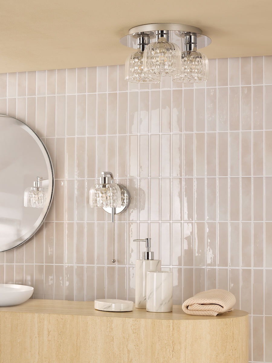 Forseti Bathroom Wall Light Polished Chrome and Glass IP44 - The Forseti wall light combines compact design with sparkling detail, making it a stylish choice for modern interiors. Featuring a polished chrome backplate and a delicate crystal-accented glass shade, it casts a warm, inviting glow while adding sophistication to any room.