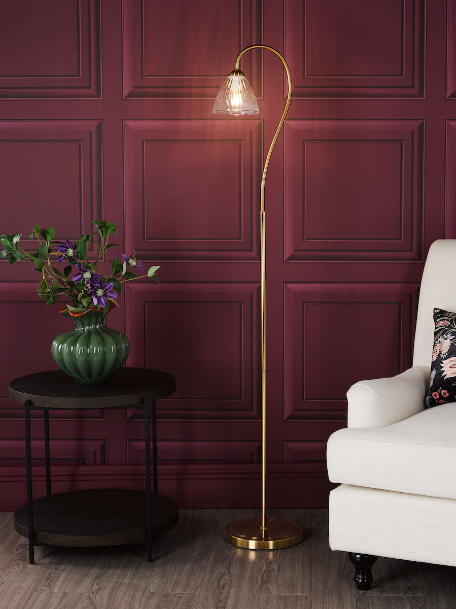 Glynis Floor Lamp Antique Bronze and Ribbed Glass - The Glynis floor lamp in bronze offers a rich, timeless take on a classic design. Crafted from steel with a warm bronze finish, it features a graceful swan-neck curve and stepped base for subtle architectural detail. A smoked ribbed glass shade completes the look, casting a soft, diffused glow that enhances both modern and traditional interiors.