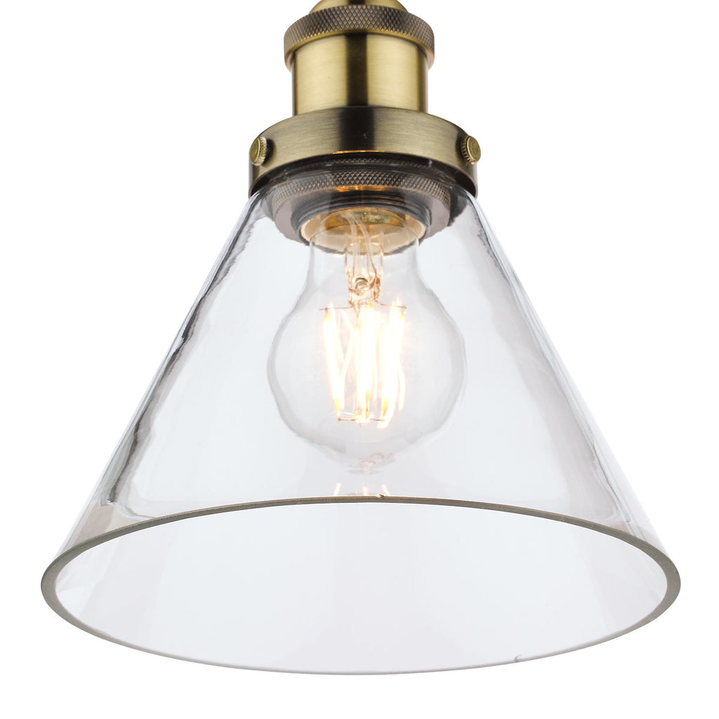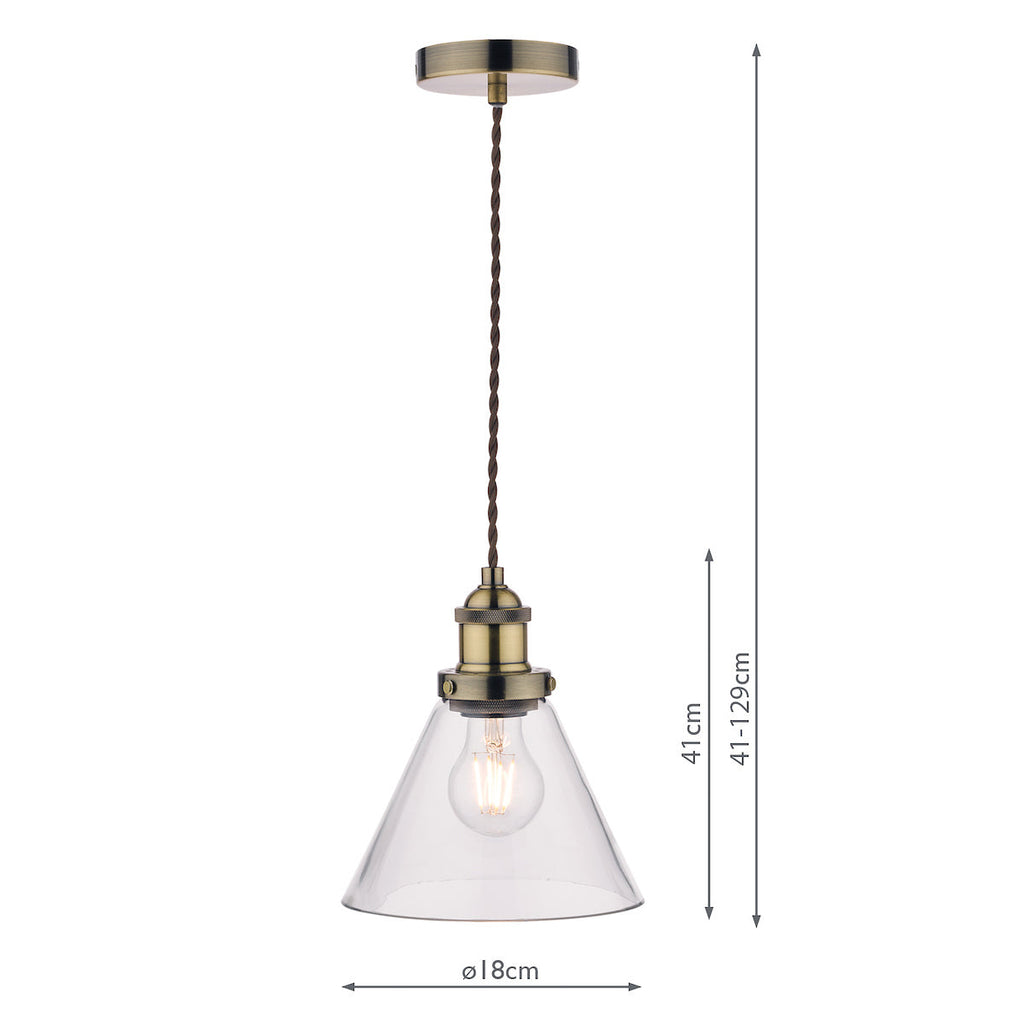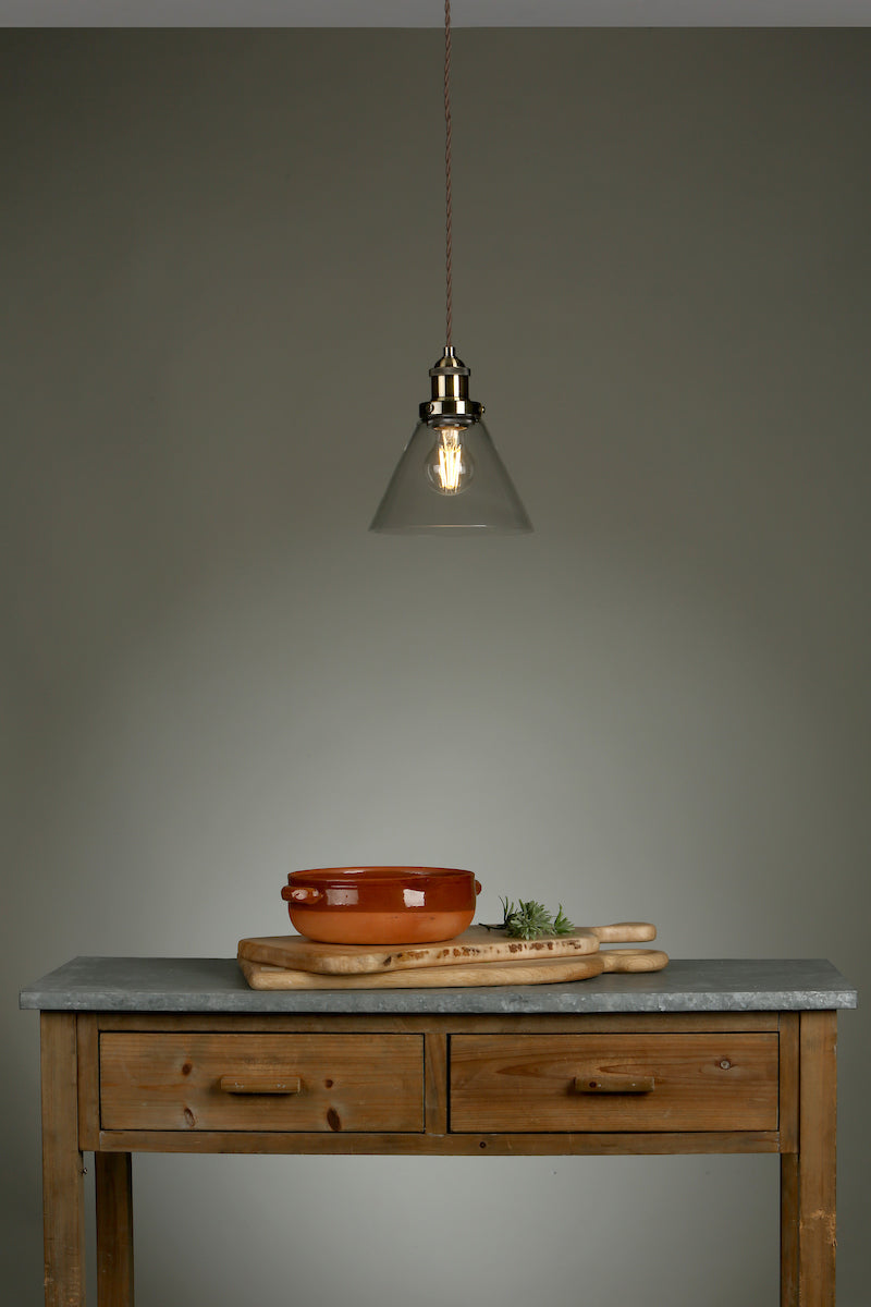 Isaac Antique Brass 1 Light Pendant Ceiling Light - Laura Ashley’s Isaac single light pendant fits effortlessly into kitchens and dens. Bold lines and angular shapes lend a sophisticated, contemporary touch that looks fantastic against bare brickwork. This contemporary hanging ceiling light boasts industrial appeal with a warm antique brass finish and cone-shaped clear glass shade. This ceiling pendant fitting has a matching ceiling rose and a coordinating brown twisted braid cable. Height is adjustable at the point of installation (41–129cm). SPECIFICATIONS: H: 1010MM DIA/W: 180MM MIN H: 410MM MAX H: 1290MM MAX WATT: 1 X 60W E27 (ES) GLS (BULB NOT INC.) CLASS: 2 - Double Insulated IP RATING: IP20 FINISH: ANTIQUE BRASS,GLASS