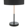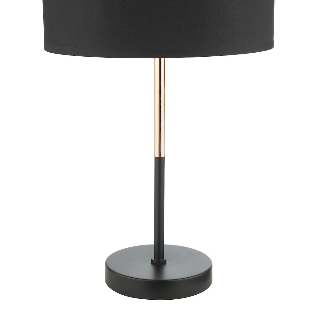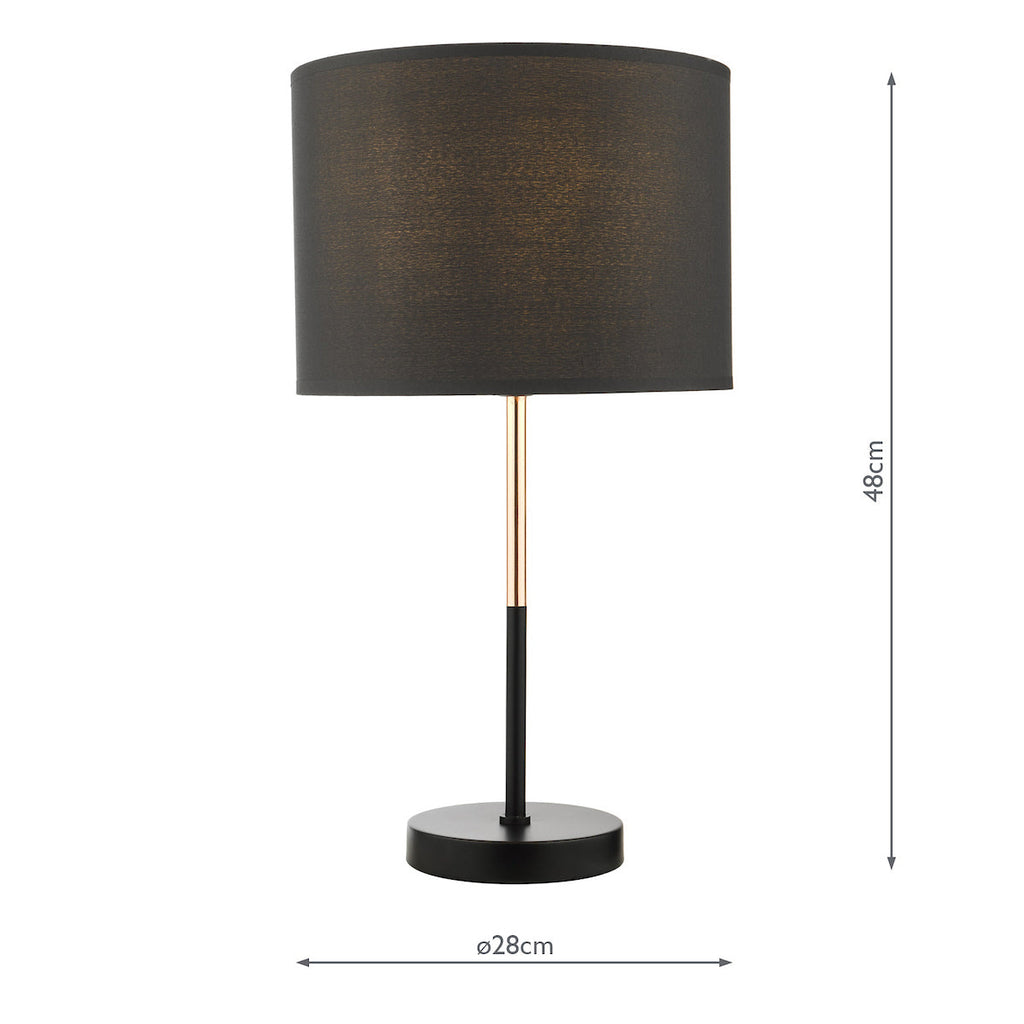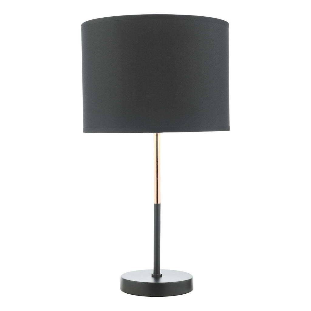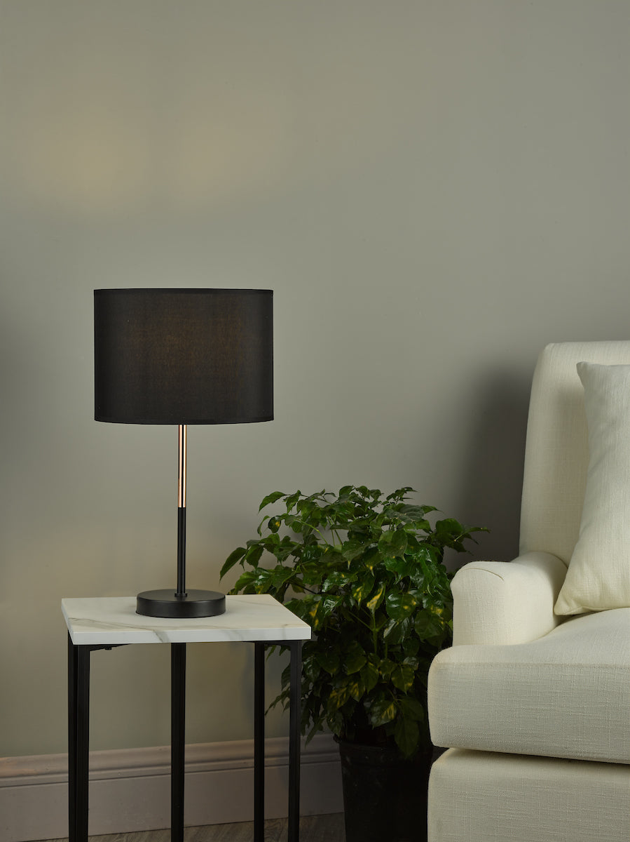 Kelso Table Lamp Matt Black Polished Copper With Shade - The Kelso table lamp is simple and elegant with a mix of matt black and contrasting polished copper stem, complete with a matching black cotton shade. Fitted with an in-line rocker switch for ease of us. SPECIFICATIONS: H:480MM W/DIA:280MM BASE MEASUREMENTS: W/DIA:130MM H: 340MM SHADE MEASUREMENTS: H: 200MM DIA: 280MM MAX WATT:1 X 60W E27 (ES) GLS (BULB NOT INC.) CLASS: 2 - Double Insulated IP RATING: IP20 SWITCH: In Line Rocker