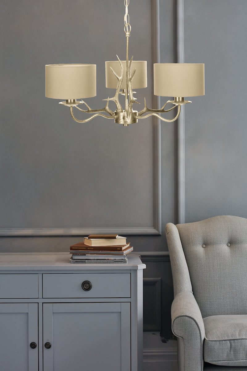 Mulroy Antler 3 Light Chandelier with Shades - Make a statement with the Laura Ashley Mulroy 3-armed ceiling fitting, a beautifully crafted, candelabra style chandelier that makes a rather grand, country house statement. Featuring a resin antler design, this contemporary interpretation of a nostalgic style boasts a hand-finished shimmering antique champagne look for a touch of luxury. Shades in a sheened, natural colour fabric are included. This ceiling pendant fitting has a matching finish ceiling rose, lampholder and hanging chain plus a discreet clear cable. Height is adjustable at the point of installation. SPECIFICATIONS: H: 880MM DIA/W: 470MM MIN H: 450MM MAX H: 880MM MAX WATT: 3 X 25W E14 (SES) GB (BULB NOT INC.) CLASS: 2 - Double Insulated IP RATING: IP20 FINISH: CREAM GOLD,NATURAL