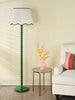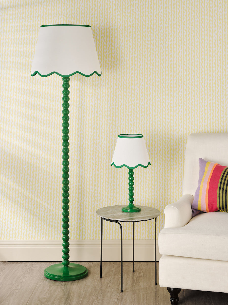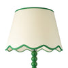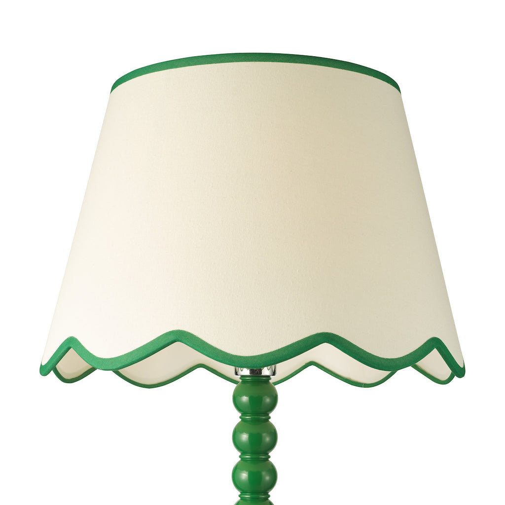 Spool Floor Lamp Green With Shade - Make a statement with the Spool Floor Lamp paired with the Poma Shade – a striking blend of colour, form and natural texture. The tall, sculptural bobbin-style base in a striking green hue brings playful character and modern charm, while the Poma Shade in natural linen with a green scalloped edge adds soft texture and Boho-inspired elegance.